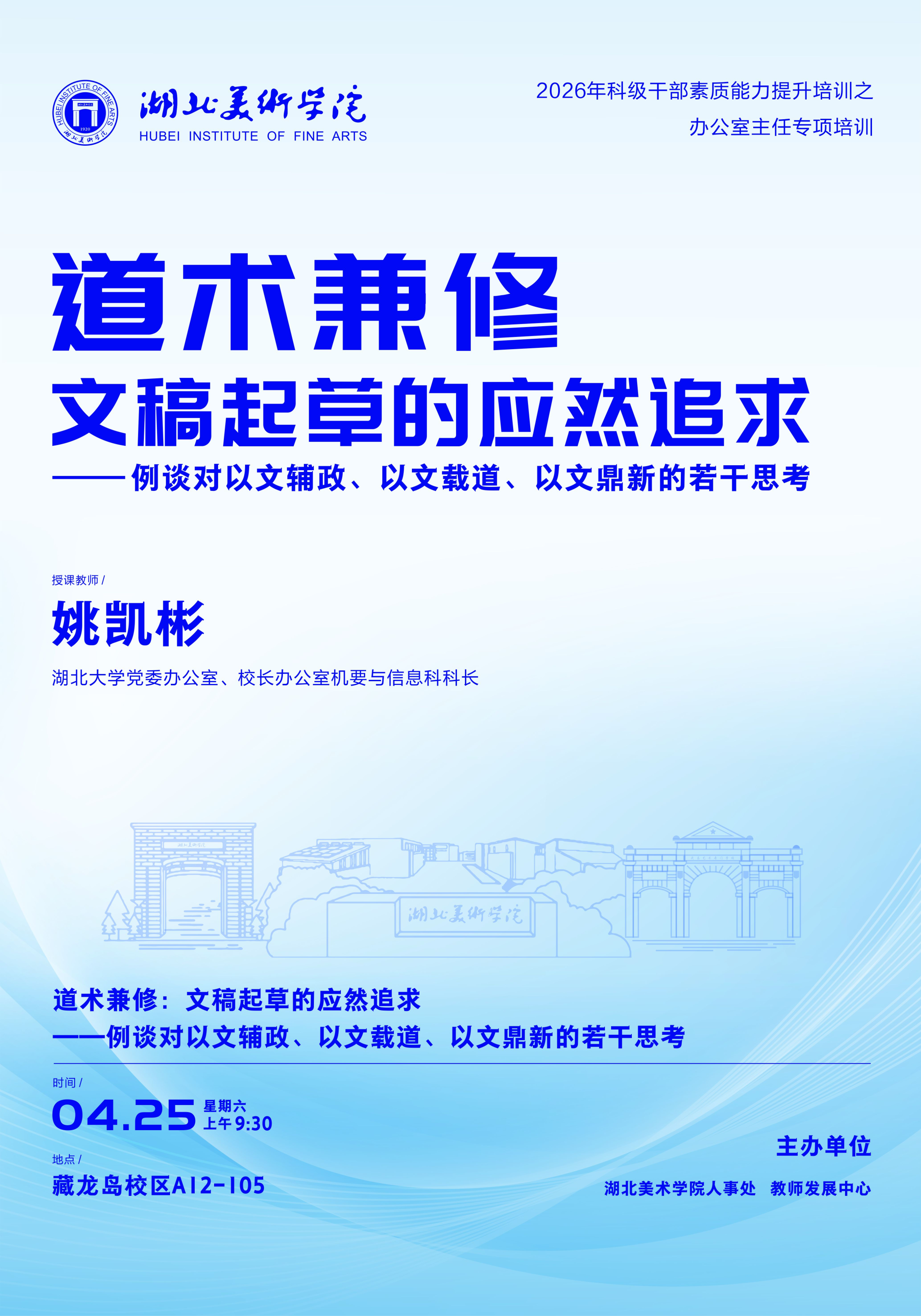 为深入落实学校“提质向优年”“1236”工作部署,进一步提升办公室主任办文、办事、办会核心能力,强化行政服务保障效能,助力学校高质量发展,人事处组织开展2026年科级干部素质能力提升培训之办公室主任专项培训,参训对象涵盖各教学单位办公室主任、办公室助理。本次培训对外开放旁听,欢迎各位老师参与学习。具体培训安排如下: